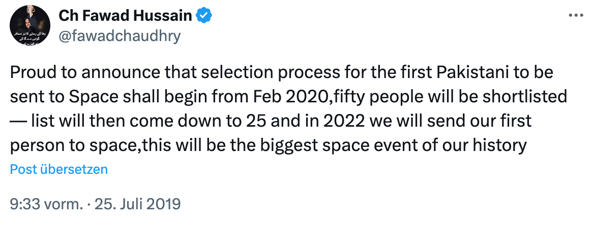 Chaudhry Fawad Hussain made the announcement on Twitter and said that the process of selection will begin from February 2020 in which 50 people will be selected and from there on, they will be shortlisted further to 25 people and in the year 2022, Pakistan will send its first person in space.