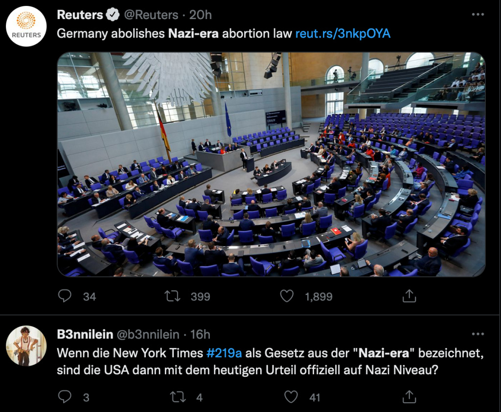 What actually happened was, that the German parliament voted to strike down a Nazi-era law that forbade the doctors to advertise abortion related services. But again, the social media users were quick to spot the uncanny and stark contrast. One country is coming out of its Nazi past whereas the other one slipping into one. President Biden didn't make it easier in his reaction where he said the Supreme Court had "literally" set the country behind by 150 years.